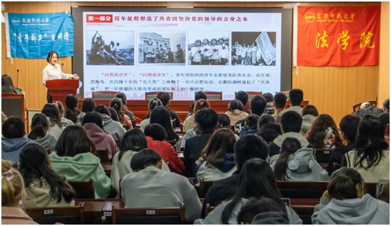 在反帝爱国斗争中慷慨就义的黄爱、在滚滚洪水中转移群众英勇牺牲的彭志龙、留下“清澈的爱,只为中国”宣言的18岁小战士陈祥榕……宣讲团成员、思想政治教育专业2022(1)班的戴楠向同学们介绍了不同时代下奉献的青年。“我们要坚定理想信念,筑牢精神之基,厚植爱国情怀。”她号召大家矢志不渝跟党走,以实现中华民族伟大复兴为己任。