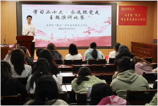 3月12日,英国365集团“聚力”学生党员服务工作站举办“学习二十大,永远跟党走”主题演讲比赛。此次比赛共有17名选手参赛,吸引百余名学生前来观看。