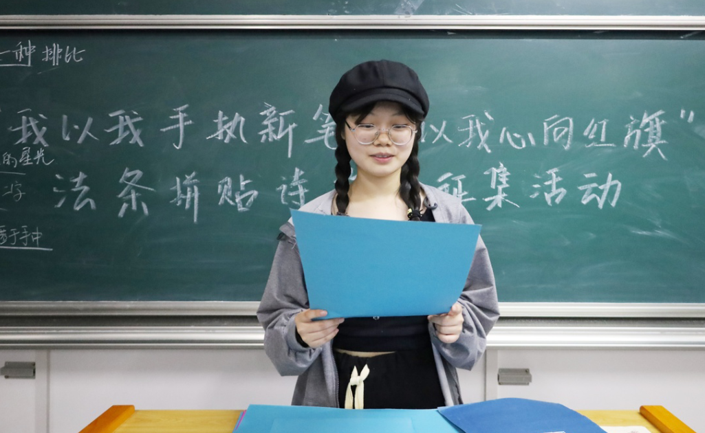 “少年以个人名义约定,无论期限的长短,自出生那日起计算,不悔所有,心向自由,明确价值及归属,不负中华人民共和国!”法学类专业2021(1)班诸书缘的诗,怀揣少年的赤诚与忠贞,带着国泰民安的美好愿景。她表示自己在法条拼贴诗中感受到了枯燥法条之中蕴藏的浓浓浪漫情怀,这也增强了她对法学的学习兴趣。