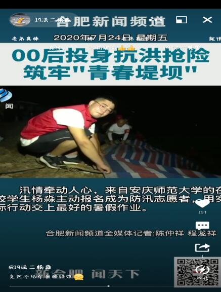 据了解,在日常学习和生活中,杨淼也积极参与各类志愿服务活动,参加学校汇爱志愿队,关爱脑瘫儿童;在新冠疫情爆发期间,在家乡作为志愿者积极参与疫情防控工作;此次第一时间主动投身抗洪抢险,其先进事迹更是受到了合肥新闻频道的报道。