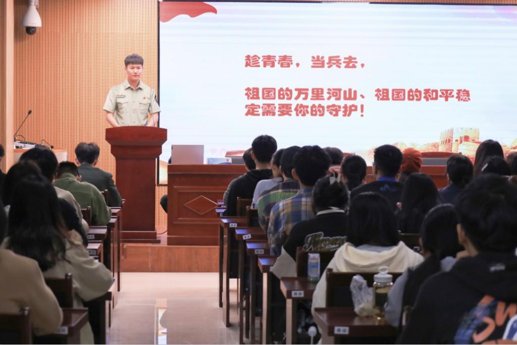 代伟用一段中华人民共和国国防部发布的2022年征兵工作视频开始了自己的演讲。他从大学生参军入伍的优惠政策、在部队的发展进步前景、退役安置政策三方面向同学们介绍了参军入伍的优势。