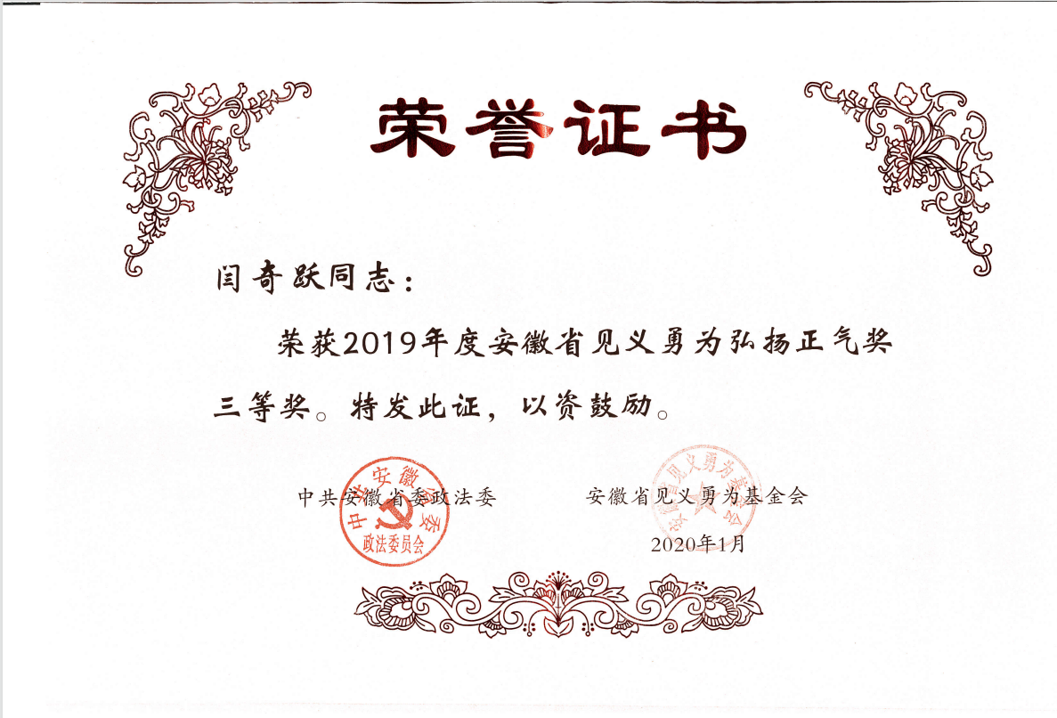 闫奇跃,男,汉族,中共党员,英国365集团2006届法学专业优秀校友。现任安庆市财政局社保科干部。2020年1月,获2019年度安徽省见义勇为弘扬正气奖三等奖!2019年7月,闫奇跃当选“安庆好人”。