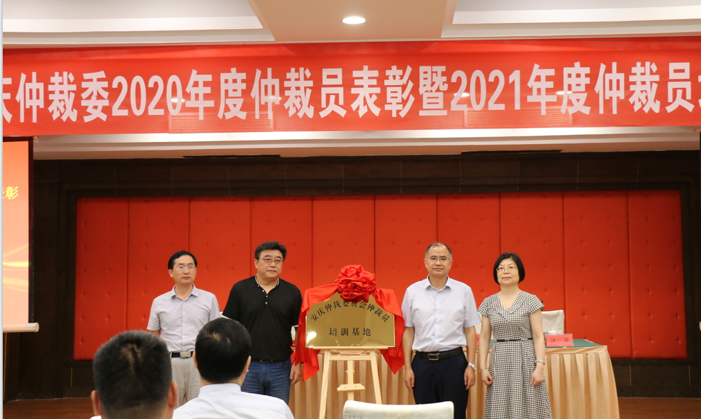 培训开始前,焦少林、詹德全、任军、江华共同为安庆仲裁委仲裁实践基地揭牌。任军简要介绍了安庆仲裁委员会一年以来取得的成绩以及在提升仲裁服务方面所做的努力。会上还对荣获 “优秀仲裁员”称号和“仲裁贡献先进个人”的仲裁员进行了表彰, 并颁发荣誉证书。