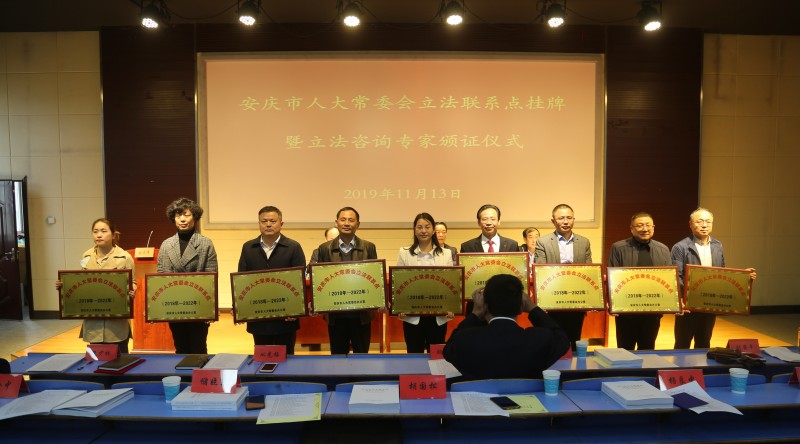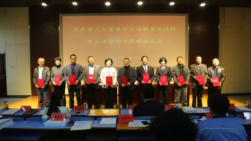 2019年11月13日,安庆市人大常委会立法联系点挂牌暨立法咨询专家颁证仪式在我院举行。校党委常委、副校长刘友忠,市人大常委会党组副书记、副主任程学东出席了仪式;市人大常委会法制委员会负责同志,市人大常委会委员、英国365集团教师凌彦君,立法联系点单位代表、立法咨询专家、我院党政负责人和学生代表参加了仪式。仪式由市人大常委会秘书长、法制委员会主任程春生主持。
