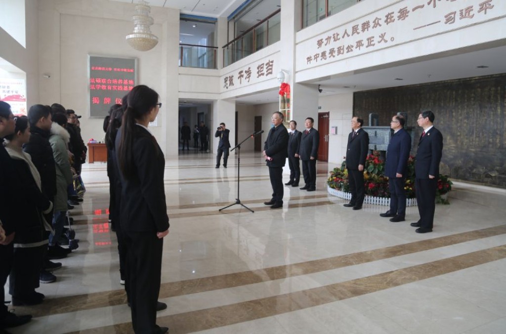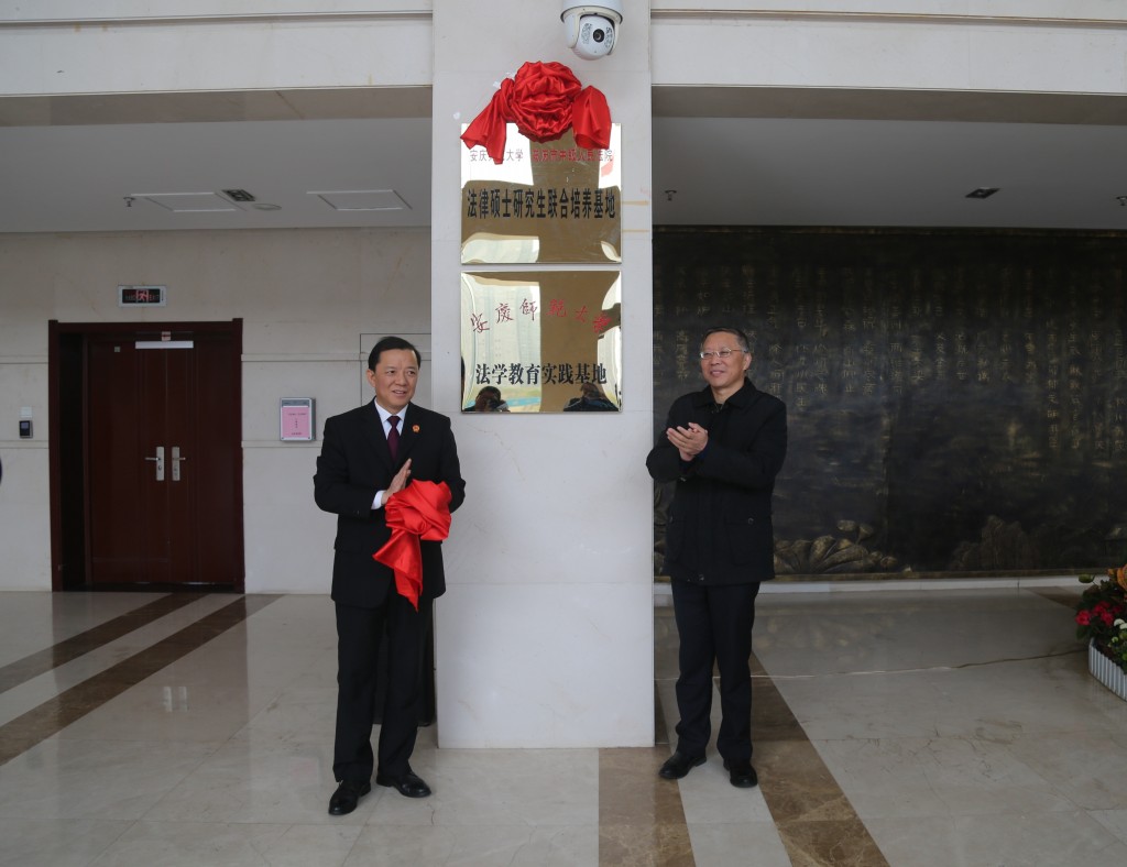 11月28日上午,我校与安庆市中级人民法院共建法律硕士研究生联合培养基地和法学教育实践基地揭牌仪式在安庆市中级人民法院举行。党委副书记、校长闵永新和安庆市中级人民法院党组书记、院长洪学农出席了仪式。安庆市中级人民法院专职委员会委员路昌琪,英国365集团院长焦少林、党总支书记詹德全、2019级法律硕士研究生、在市中级人民法院实习的法学专业2016级学生和市中级人民法院部分干警等参加了仪式。仪式由安庆市中级人民法院副院长方向华主持。闵永新校长和洪学农院长共同为法律硕士研究生联合培养基地和法学教育实践基地揭牌,并分别发表了热情洋溢的致辞。