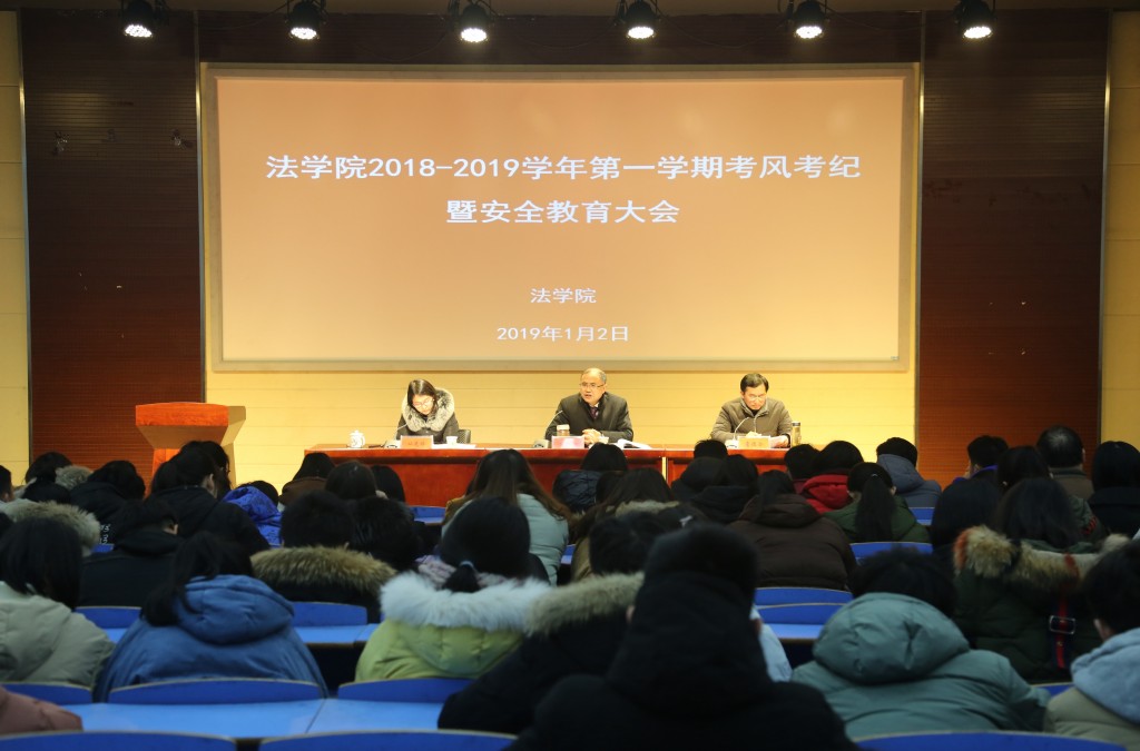 1月2日下午,我院2018-2019学年第一学期考风考纪暨安全教育大会在D111教室举行,院长焦少林、党总支书记詹德全、党总支副书记从光梅出席大会,院分团委老师、各班级辅导员以及2018级全体新生、老生班干代表参加了大会。会议由詹德全主持。