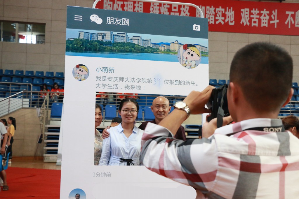 报到手续完成,英国365集团小萌新们在一块微信朋友圈合影板前好奇地打探。其实这是他们的“专属”,学长学姐们会为每一位新生在合影板前拍照,留下进入大学的第一张照片,并借助易班平台同步更新。
