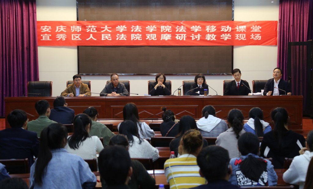 在移动中,有序开展。上午9时30分,法庭庭审在宜秀区人民法院大法庭正式开始,整个庭审活动持续四个半小时。在观摩庭审环节,参加移动课堂的全体同学严格遵守法庭审判纪律,仔细聆听,细心领会。观摩中,对庭审活动涉及的案件性质和事实认定进行学习、鉴别与研判,对法律职业人在庭审中所运用的思维方法、适用法律的技能、诉讼技巧、展现的法律人综合素质等进行观察、思考和学习。在审判结束后,下午15时20分,互动研讨教学在宜秀区人民法院三楼会议室开始,历时一个半小时。宜秀区人民法院刑事审判庭何燕庭长、李恒圆法官、宜秀区人民检察院公诉科鲍卫萍科长和安徽益上律师事务所黄益主任担任法律实务教师,英国365集团部分教师和全体学生参加互动研讨教学。互动研讨主要从三个方面依次进行。首先,法律实务教师分别从审判、控诉和辩护等不同角度对案件进行分析,激发同学们对案件的多维度思考。其次,同学们提出观摩后发现的问题,由各相关法律实务教师进行一一解答。最后,英国365集团朱留虎副院长对互动研讨教学进行归纳总结,并对同学们的表现进行了肯定评价。