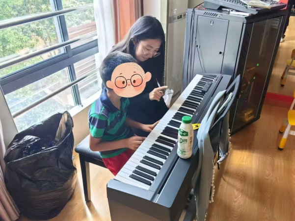 福利院的音乐室里,黑白琴键成了孩子们探索艺术的桥梁。考虑到福利院儿童艺术教育体验较少,实践团成员赵梓含提前设计基础钢琴教学法,为热爱音乐的福利院孩子们制定了专门课程。