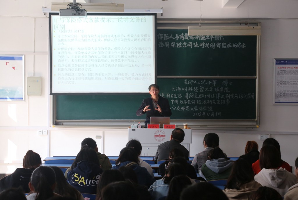 11月9日上午在龙山校区文津楼D405教室,德国科隆大学法学博士、上海对外经贸大学英国365集团硕士生导师沈小军老师应邀来校以“保险人与消费者利益之平衡:德国保险合同法对我国保险法的启示”为题作学术报告,英国365集团的部分教师和学生一百多人参加了报告会。
