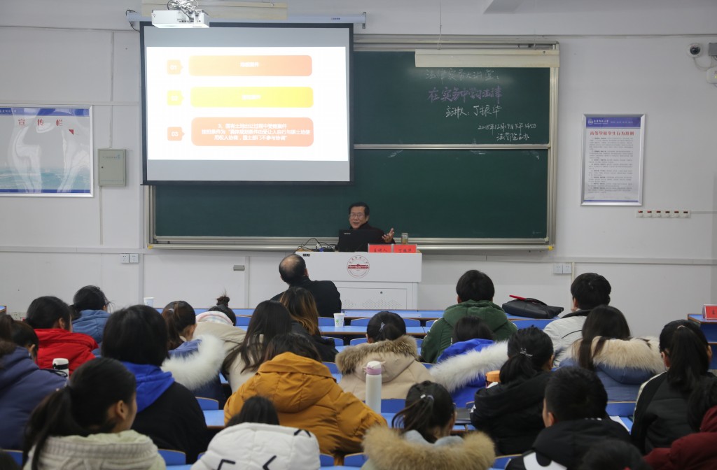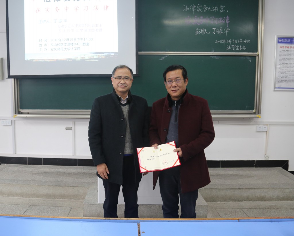 2018年12月19日下午,安徽长江人律师事务所副主任、合伙人丁振华律师应邀作客法律实务大讲堂,以“在实务中学习法律”为题作了精彩的报告。院长焦少林教授主持报告会。我院部分教师和2017级法学(1)、(3)和(4)班120余人聆听了报告。