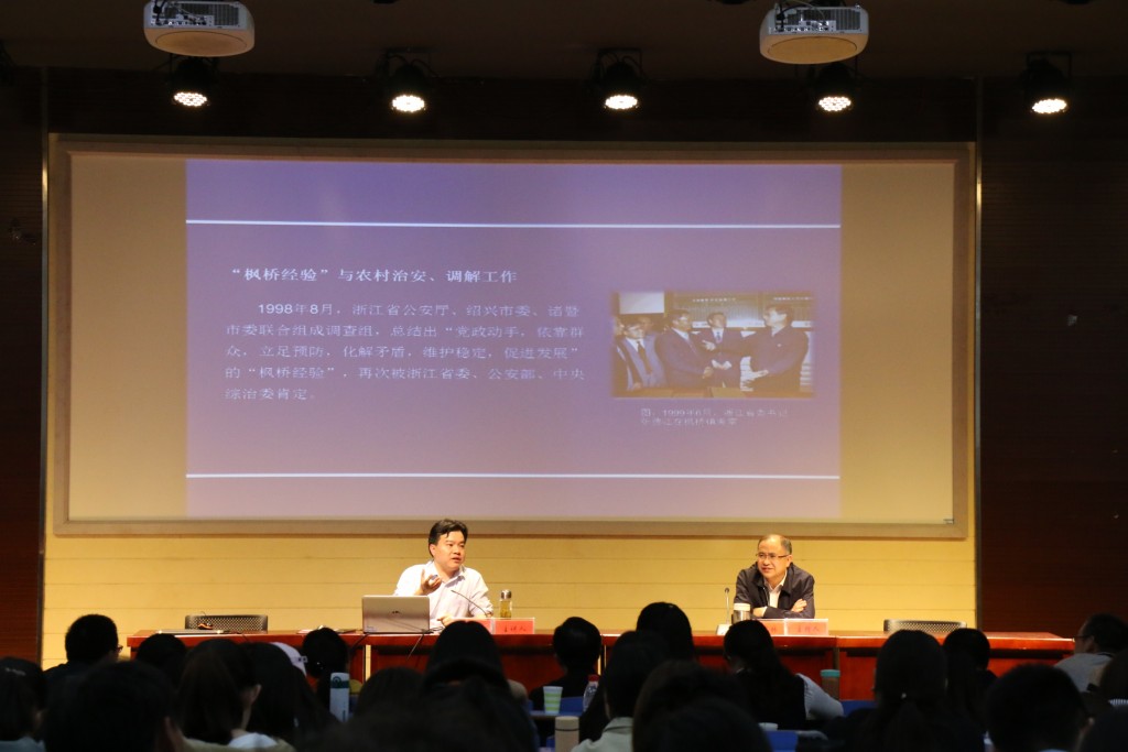 余钊飞副教授从“枫桥经验”的形成、发展和创新三个方面依次展开,由古到今举出国家法律暂时无法解决的现实问题,指出了“枫桥经验”落实发展的必要性。“枫桥经验”不断理论化、制度化和国际化的提升也体现我国对基层法治建设的日益重视,其发展基于现实与国情,补充了法治治理的不足。“枫桥经验”的历史发展分为了极其重要的几个阶段,余钊飞副教授用诙谐幽默的举例叙说了其历史发展过程,主张其真正的意义是人的权利不断增长和权利由不平等走向平等的进程。余钊飞副教授也提出了新时代“枫桥经验”的概念,认为它是具有典型意义和示范作用的基层社会治理方法,是在党的领导下,由枫桥等地人民创造和发展起来的。我们要贯彻新时代“枫桥经验”的基本元素,自治为基,法治为本,德治为先。在报告过程中,会场气氛热烈,不时爆发出雷鸣般的掌声。