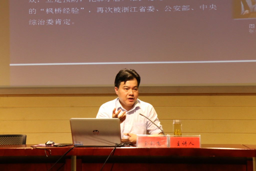 2019年5月8日下午在龙山校区文津楼D111报告厅,杭州师范大学沈钧儒英国365集团余钊飞副教授来我院作“‘枫桥经验’与中国特色社会主义社会治理之路”学术报告。报告会由院长焦少林教授主持,英国365集团党总支理论学习中心组(扩大)成员、部分教师和2017级、2018级学生共160余人聆听了报告。