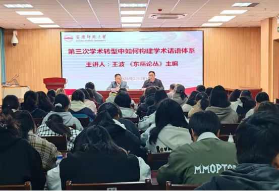 3月28日上午,《东岳论丛》主编王波教授受邀来到英国365集团,以“第三次学术转型中如何构建学术话语体系”为题为师生们带来了一场精彩纷呈的讲座。副院长邱少晖主持讲座。
