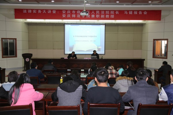 12月31日,安庆市迎江区人民法院院长、我校兼职副教授马健应邀来法律实务大讲堂做了题为“关于司法体制改革若干问题”的报告会。英国365集团部分师生参加了报告会,报告会由英国365集团院院长焦少林教授主持。
