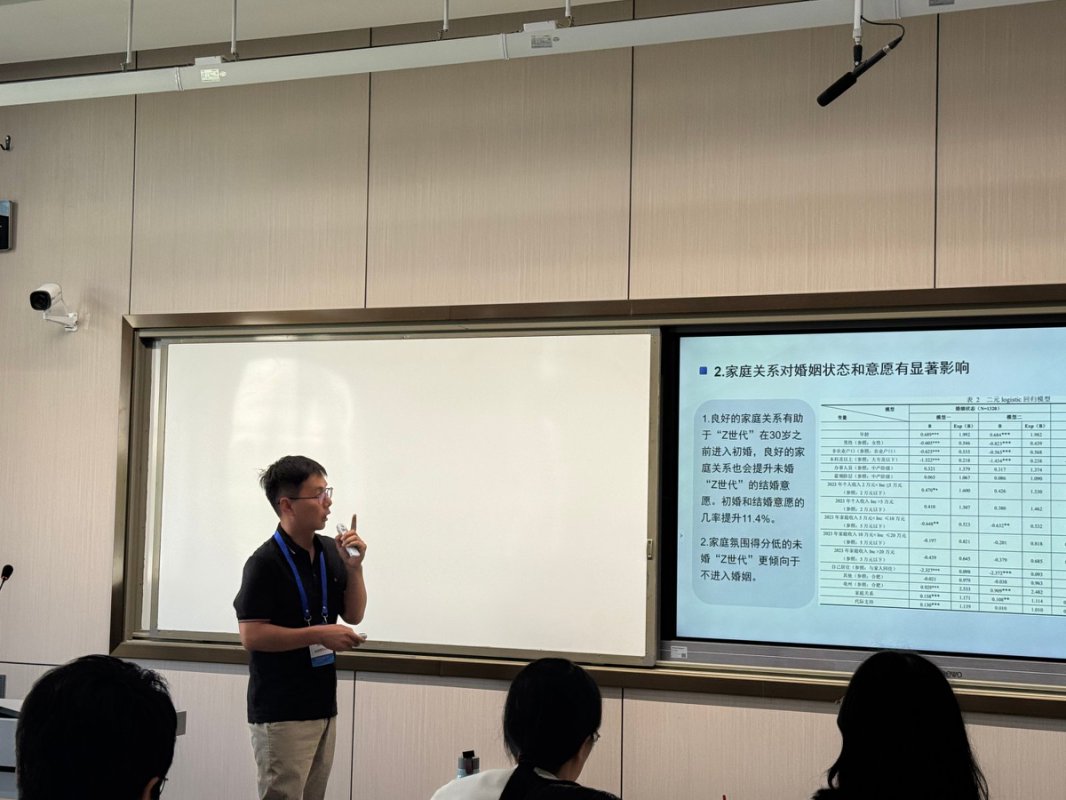 张弛的文章《新旧家庭观念交融下Z世代适婚群体的婚恋策略》入选“中国式家庭现代化的理论探索与经验研究”论坛,他围绕Z世代在不同家庭观念下的婚恋策略进行分享交流。钱俊月的文章入选了“技术、劳动与社会”论坛,她分享了对中介如何通过文化营销塑造照料商品形象并导致家政劳动情感剥离的研究。